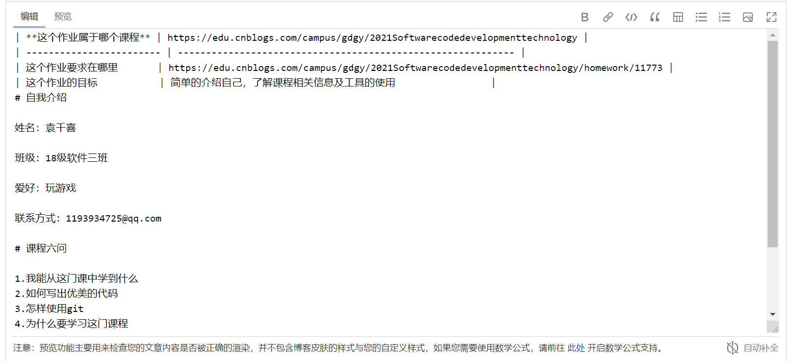 | 这个作业的目标 | 简单的介绍自己,了解课程相关信息及工具的使用 |
