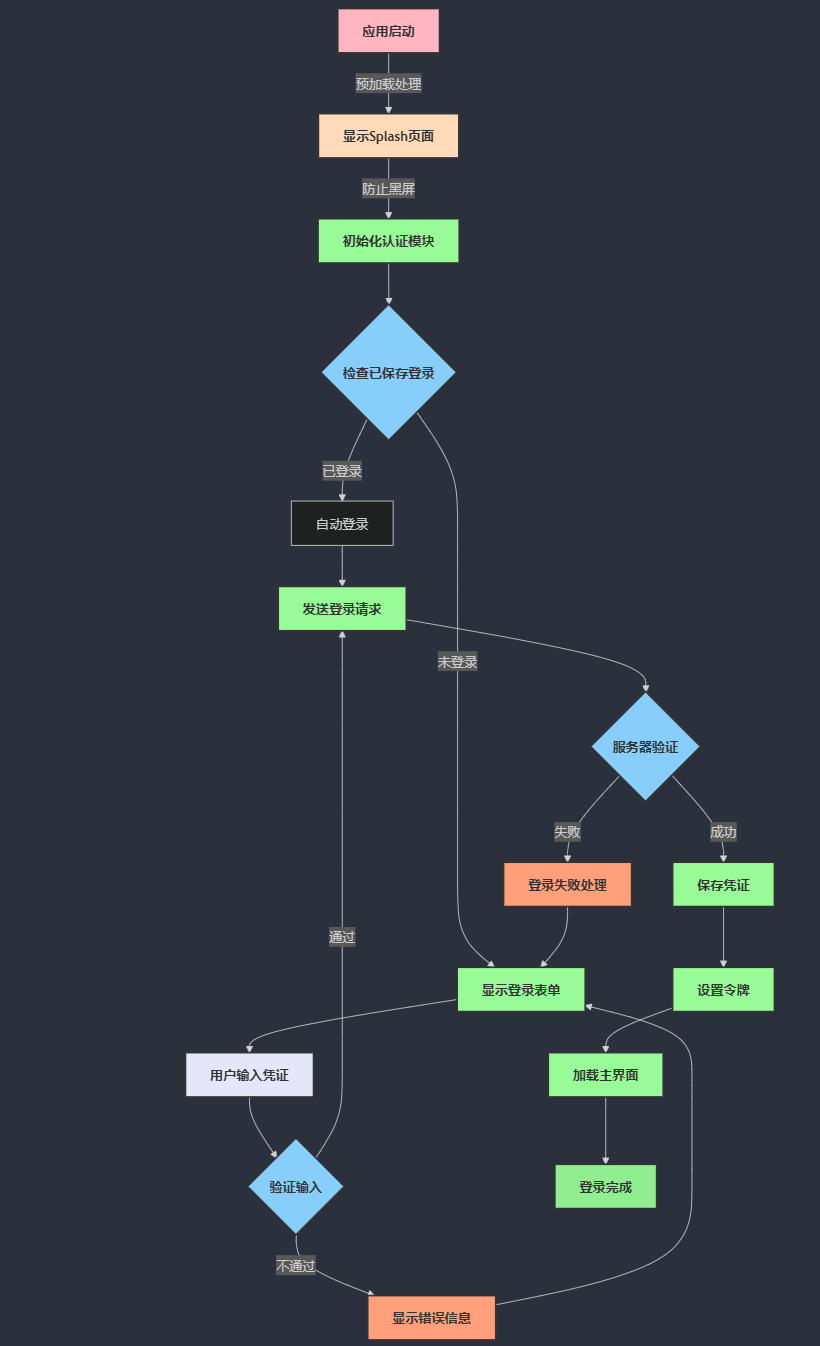 (启动→检查缓存→自动登录/表单登录→服务器验证→主界面)