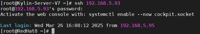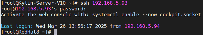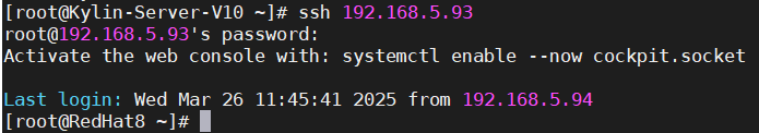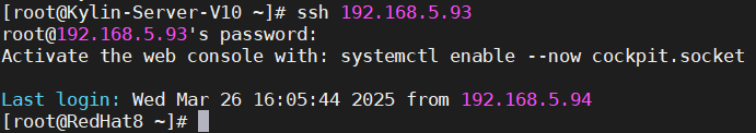 1 [root@RedHat8 ~]# cat /etc/ssh/sshd_config 2 3 4 # Example of overriding settings on a per-user basis 5 #Match User anoncvs 6 # X11Forwarding no 7 # AllowTcpForwarding no 8 # PermitTTY no 9 # ForceCommand cvs server 10 AllowUsers root@192.168.5.94 #允许192.168.5.94主机的root用户远程 11 DenyUsers root@192.168.5.0/24 #拒绝192.168.5.0段IP主机的root用户远程