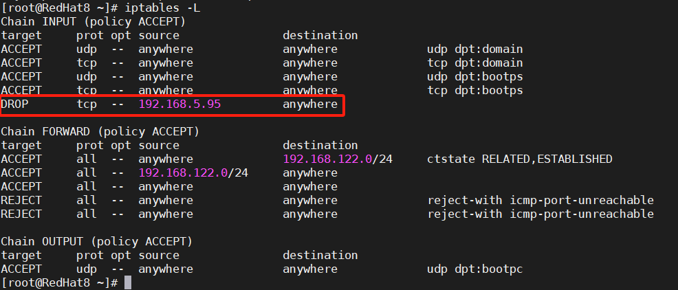 执行命令: iptables -A INPUT -p tcp -s 192.168.5.95 -j DROP ,禁止指定IP访问
