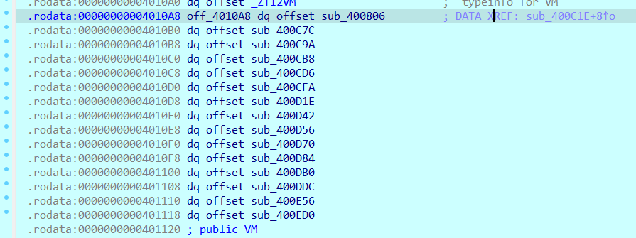 都是些未知函数,那么显然,该vm就是通过a1进行取址然后调用函数,对栈空间,寄存器之类的东西进行操控