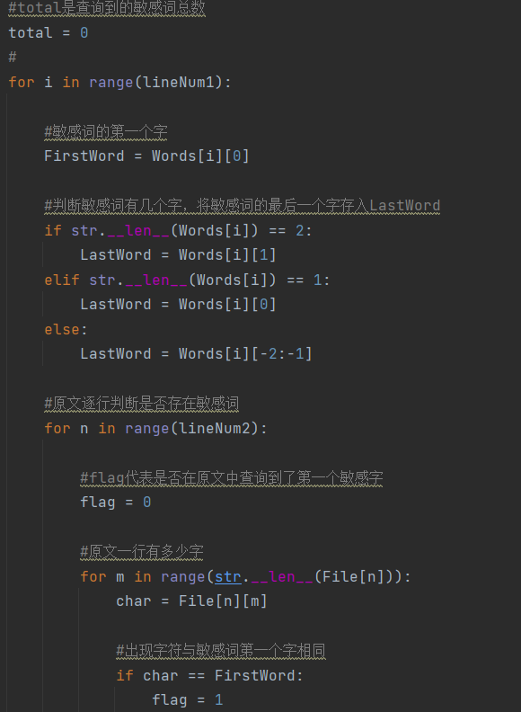 算法的关键主要是首先把敏感词一个字一个字的拆开,然后把原文中的每一行的每一个字对过去————如果发现有字与敏感词的第一个字相同,用flag=1标志找到了敏感词,并记下这个字在这行的位置(方便后续输出);然后判断同一行是否还有敏感词的后续几个字,若有,则记录下敏感词最后一个字的位置(方便后续输出),并且将total数+1,以及例如“line3:......"