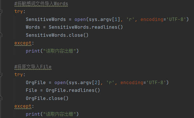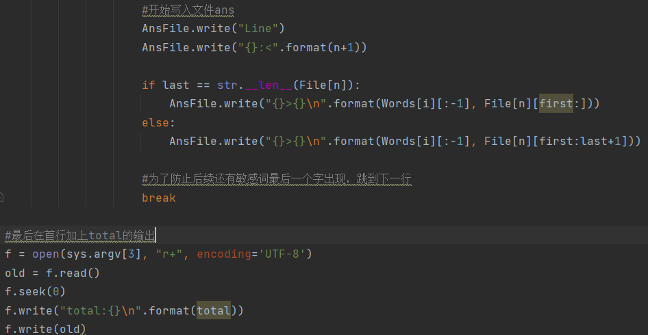 最开始看到这个题目就打算用python写,自学了一周多。从数据类型到python的类与函数,最后发现网上教的内容太浅了,无论是AC自动机还是DFA都看不懂……于是就打算用之前c++的写法写python,至少能够找到最初始的一些敏感词。因为没有用较难的算法,用一个主函数就解决了。
