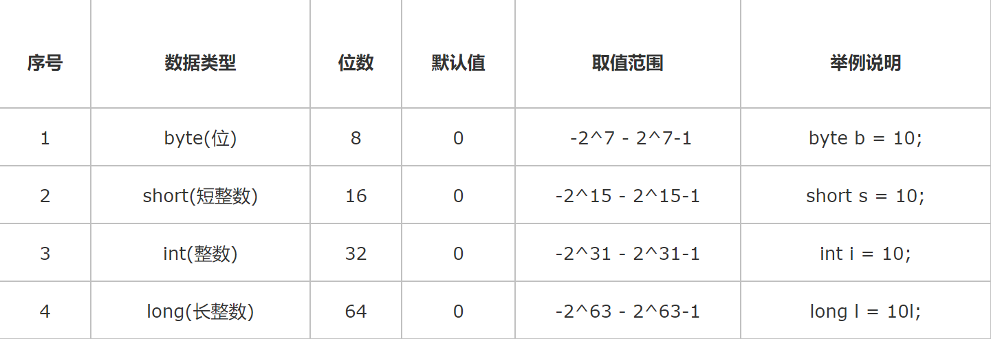 常用的整数类型是 int 和 long,byte 和 short 基本不用,常用的小数类型是 double,float 基本不用。