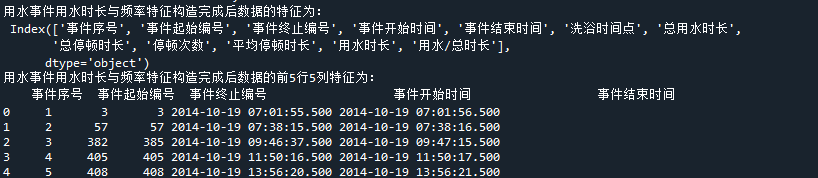 print('用水事件用水时长与频率特征构造完成后数据的前5行5列特征为:\n',