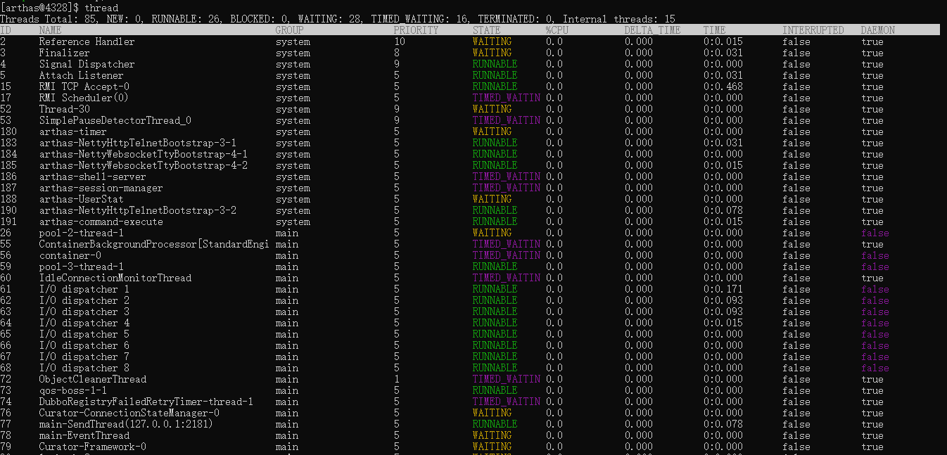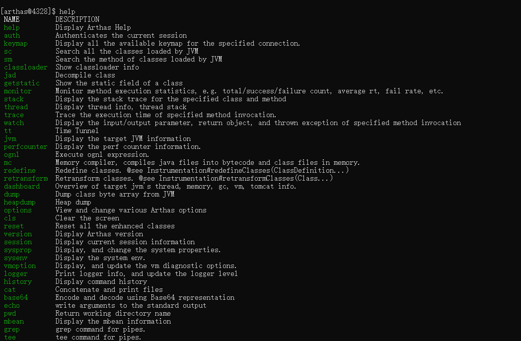 在arthas交互环境中,可以输入help命令,然后会出现所有arthas支持的命令