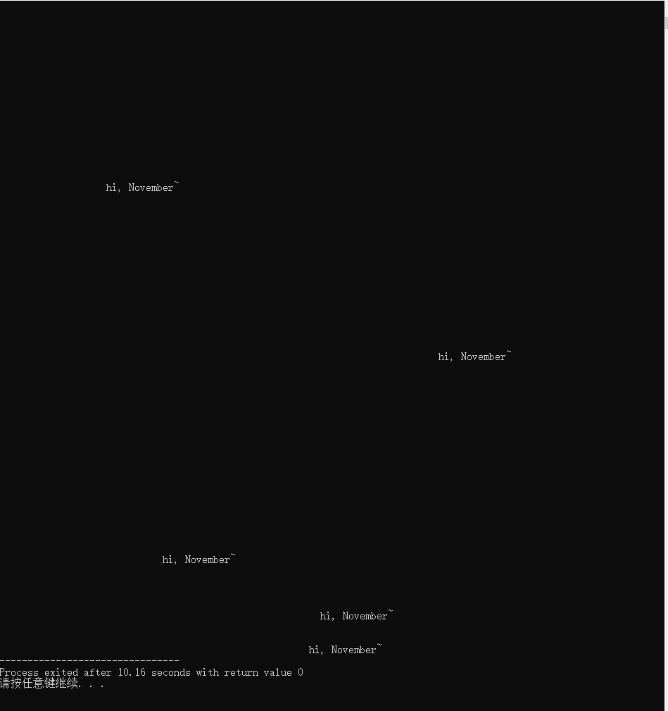 1 #include <stdio.h> 2 #include <stdlib.h> 3 #include <time.h> 4 #include <windows.h> 5 #define N 80 6 7 void print_text(int line, int col, char text[]); 8 void print_spaces(int n); 9 void print_blank_lines(int n); 10 11 int main() { 12 int line, col, i; 13 char text[N] = "hi, November~"; 14 15 srand(time(0)); 16 17 for(i = 1; i <= 10; ++i) { 18 line = rand() % 25; 19 col = rand() % 80; 20 print_text(line, col, text); 21 Sleep(1000); 22 } 23 24 return 0; 25 } 26 27 void print_spaces(int n) { 28 int i; 29 30 for(i = 1; i <= n; ++i) 31 printf(" "); 32 } 33 34 35 void print_blank_lines(int n) { 36 int i; 37 38 for(i = 1; i <= n; ++i) 39 printf("\n"); 40 } 41 42 43 void print_text(int line, int col, char text[]) { 44 print_blank_lines(line-1); 45 print_spaces(col-1); 46 printf("%s", text); 47 }