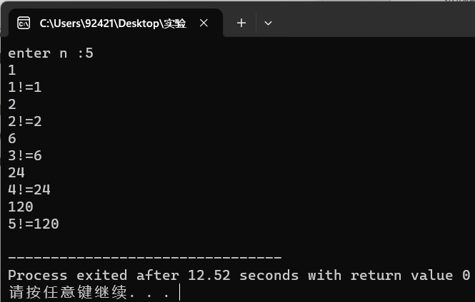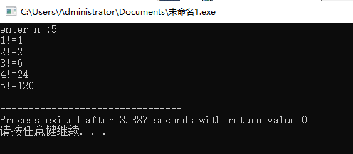 1 # include <stdio.h> 2 long long fac(int n); 3 4 int main(){ 5 int i,n; 6 7 printf("enter n :"); 8 scanf("%d",&n); 9 for(i=1;i<=n;++i) 10 printf("%d!=%lld\n",i,fac(i)); 11 12 return 0; 13 } 14 15 long long fac(int n){ 16 static long long p=1; 17 18 p= p*n; 19 printf("%lld\n",p); 20 return p; 21 }