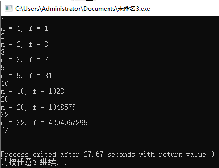 1 #include <stdio.h> 2 long long func(int n); 3 int main() { 4 int n; 5 long long f; 6 7 while (scanf("%d", &n) != EOF) { 8 f = func(n); 9 printf("n = %d, f = %lld\n", n, f); 10 } 11 12 return 0; 13 } 14 15 long long func(int n){ 16 long long int ans; 17 if(n==1) 18 ans=1; 19 else 20 ans=2*(func(n-1)+1)-1; 21 return ans; 22 }