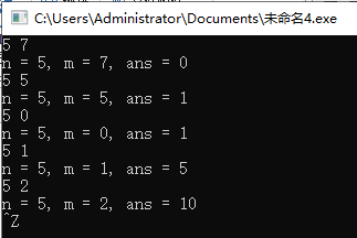 1 #include <stdio.h> 2 int func(int n, int m); 3 4 int main() { 5 int n, m; 6 7 while(scanf("%d%d", &n, &m) != EOF) 8 printf("n = %d, m = %d, ans = %d\n", n, m, func(n, m)); 9 10 return 0; 11 } 12 13 int func(int n,int m){ 14 int ans; 15 if(n<m) 16 ans=0; 17 else{ 18 if(n==m||m==0) 19 ans=1; 20 else 21 ans=func(n-1,m)+func(n-1,m-1); 22 } 23 return ans; 24 }