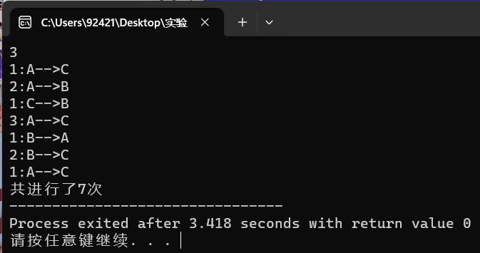1 #include<stdio.h> 2 #include<stdlib.h> 3 void hano(unsigned int n,char from,char temp,char to); 4 void move(unsigned int n,char from,char to); 5 long long func(unsigned int n); 6 int main() 7 { 8 unsigned int n; 9 scanf("%u",&n); 10 hano(n,'A','B','C'); 11 printf("共进行了%lld次",func(n)); 12 return 0; 13 } 14 void hano(unsigned int n,char from,char temp,char to){ 15 if(n==1){ 16 move(n,from,to); 17 } 18 else{ 19 hano(n-1,from,to,temp); 20 move(n,from,to); 21 hano(n-1,temp,from,to); 22 } 23 } 24 void move(unsigned int n,char from,char to){ 25 printf("%u:%c-->%c\n",n,from,to); 26 } 27 28 long long func(unsigned int n){ 29 long long int ans; 30 if(n==1) 31 ans=1; 32 else 33 ans=2*(func(n-1)+1)-1; 34 return ans; 35 }