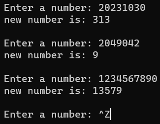 1 #include <stdio.h> 2 #include <math.h> 3 long func(long s); 4 5 int main() { 6 7 long s, t; 8 9 printf("Enter a number: "); 10 while (scanf("%ld", &s) != EOF) { 11 t = func(s); 12 printf("new number is: %ld\n\n", t); 13 printf("Enter a number: "); 14 } 15 16 return 0; 17 } 18 long func(long s) { 19 20 21 long t=0,ans = 0; 22 int i; 23 while (s > 0) { 24 i = s % 10; 25 if (i % 2 == 1) { 26 ans = ans * 10 + i; 27 } 28 s /= 10; 29 } 30 while(ans>0){ 31 t=ans%10+t*10; 32 ans/=10; 33 }