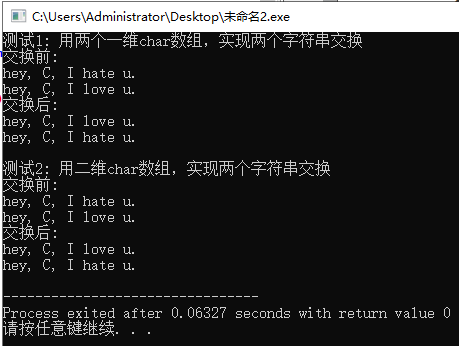 1 #include <stdio.h> 2 #include <string.h> 3 4 #define N 80 5 6 void swap_str(char s1[N], char s2[N]); 7 void test1(); 8 void test2(); 9 10 int main() { 11 printf("测试1: 用两个一维char数组,实现两个字符串交换\n"); 12 test1(); 13 14 printf("\n测试2: 用二维char数组,实现两个字符串交换\n"); 15 test2(); 16 17 return 0; 18 } 19 void test1() { 20 char views1[N] = "hey, C, I hate u."; 21 char views2[N] = "hey, C, I love u."; 22 23 printf("交换前: \n"); 24 puts(views1); 25 puts(views2); 26 swap_str(views1, views2); 27 printf("交换后: \n"); 28 puts(views1); 29 puts(views2); 30 } 31 void test2() { 32 char views[2][N] = {"hey, C, I hate u.", 33 "hey, C, I love u."}; 34 printf("交换前: \n"); 35 puts(views[0]); 36 puts(views[1]); 37 swap_str(views[0], views[1]); 38 printf("交换后: \n"); 39 puts(views[0]); 40 puts(views[1]); 41 } 42 void swap_str(char s1[N], char s2[N]) { 43 char tmp[N]; 44 strcpy(tmp, s1); 45 strcpy(s1, s2); 46 strcpy(s2, tmp); 47 }