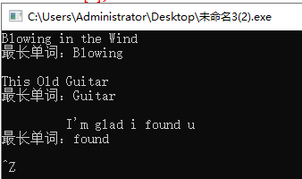 1 #include<stdio.h> 2 #define N 1000 3 4 int main(){ 5 char line[N]; 6 int word_len; 7 int max_len; 8 int end; 9 int i; 10 11 while(gets(line)!=NULL){ 12 word_len=0; 13 max_len=0; 14 end=0; 15 16 i=0; 17 while(1){ 18 while(line[i]==' '){ 19 word_len=0; 20 i++; 21 } 22 while(line[i]!='\0'&&line[i]!=' '){ 23 word_len++; 24 i++; 25 } 26 if(max_len<word_len){ 27 max_len=word_len; 28 end=i; 29 } 30 if(line[i]=='\0') 31 break; 32 } 33 printf("最长单词:"); 34 for(i=end-max_len;i<end;++i) 35 printf("%c",line[i]); 36 printf("\n\n"); 37 } 38 39 return 0; 40 } 41