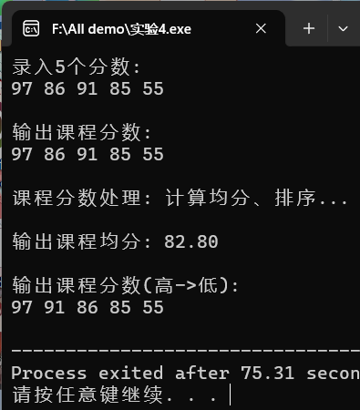 #include <stdio.h> #define N 5 void input(int x[], int n); void output(int x[], int n); double average(int x[], int n); void bubble_sort(int x[], int n); int main() { int scores[N]; double ave; printf("录入%d个分数:\n", N); input(scores, N); printf("\n输出课程分数: \n"); output(scores, N); printf("\n课程分数处理: 计算均分、排序...\n"); ave = average(scores, N); bubble_sort(scores, N); printf("\n输出课程均分: %.2f\n", ave); printf("\n输出课程分数(高->低):\n"); output(scores, N); return 0; } void input(int x[], int n) { int i; for(i = 0; i < n; ++i) scanf("%d", &x[i]); } void output(int x[], int n) { int i; for(i = 0; i < n; ++i) printf("%d ", x[i]); printf("\n"); } double average(int x[],int n){ int sum=0,i=0; double ans; for(;i<n;i++){ sum=sum+x[i]; } ans=(double)sum/n; return ans; } void bubble_sort(int x[],int n){ int i,j,t; for(i=0;i<n-1;i++){ for(j=0;j<n-1-i;j++){ if(x[j]<x[j+1]){ t=x[j]; x[j]=x[j+1]; x[j+1]=t; } } } }