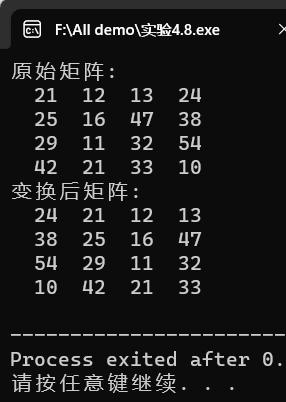 1 #include <stdio.h> 2 #define N 100 3 #define M 4 4 void output(int x[][N], int n); 5 void rotate_to_right(int x[][N], int n); 6 int main() { 7 int t[][N] = {{21, 12, 13, 24}, 8 {25, 16, 47, 38}, 9 {29, 11, 32, 54}, 10 {42, 21, 33, 10}}; 11 printf("原始矩阵:\n"); 12 output(t, M); 13 rotate_to_right(t, M); 14 printf("变换后矩阵:\n"); 15 output(t, M); 16 return 0; 17 } 18 19 void output(int x[][N], int n) { 20 int i, j; 21 for (i = 0; i < n; ++i) { 22 for (j = 0; j < n; ++j) 23 printf("%4d", x[i][j]); 24 printf("\n"); 25 } 26 } 27 28 void rotate_to_right(int x[][N], int n) 29 { 30 int i,j,a[4]; 31 for(i=0;i<4;i++) 32 { 33 a[i]=x[i][4-1]; 34 } 35 for(i=0;i<n;i++) 36 { 37 for(j=4-1;j>0;--j) 38 { 39 x[i][j]=x[i][j-1]; 40 41 } 42 x[i][0]=a[i]; 43 } 44 }