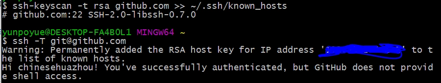 验证时提示是否continue,输入yes,若成功就会看到:You've successfully authenticated, but GitHub does not provide shell access 。