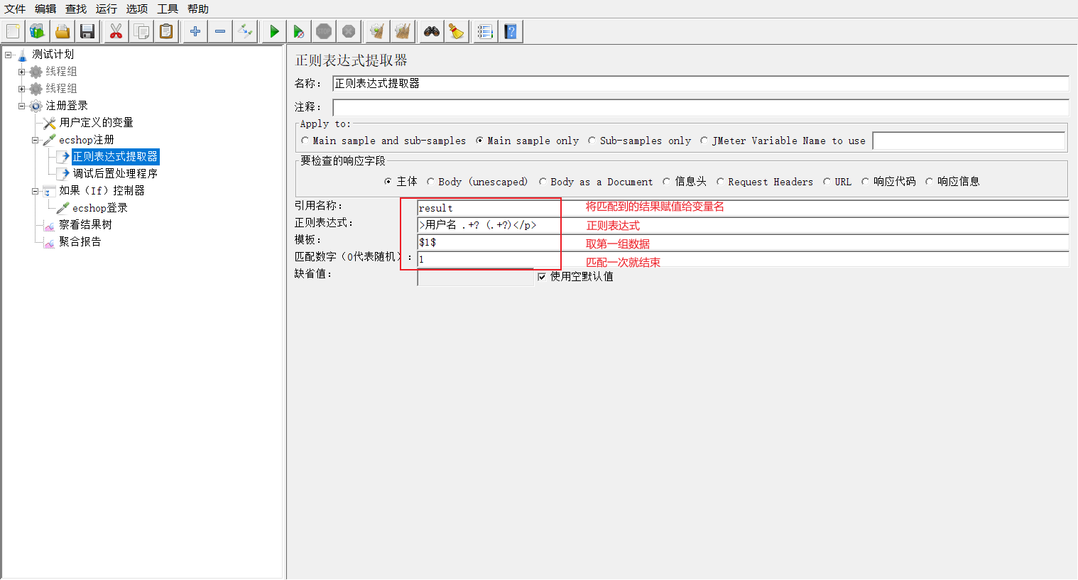 3、正则表达式匹配注册响应结果(正则表达式提取器在请求里面的后置处理器中添加),可以添加一个debug,方便查看匹配到的内容