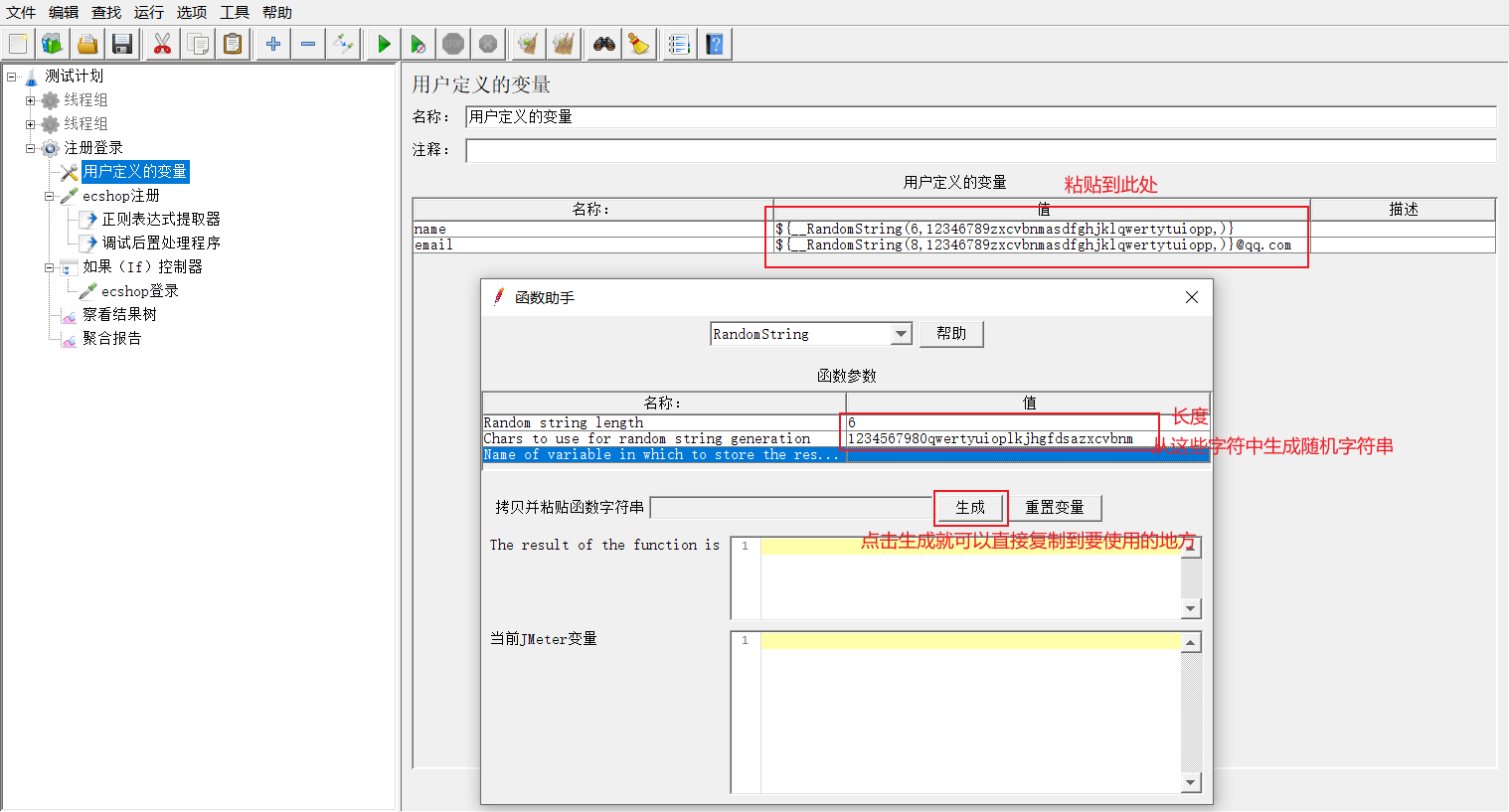2、参数化的形式,使用函数助手随机生成用户名和email,点击一下生成的内容就可以复制到剪贴板