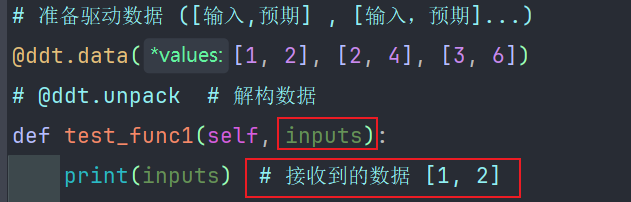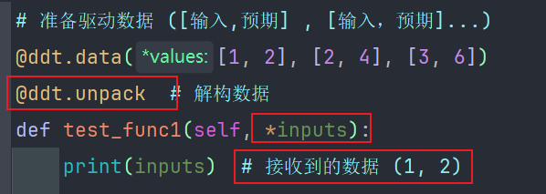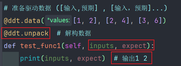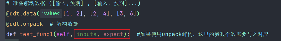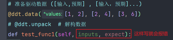 4、如果测试用例需要多个参数,可以使用@unpack装饰器来解包元组或列表,或者确保字典的键与参数名一致