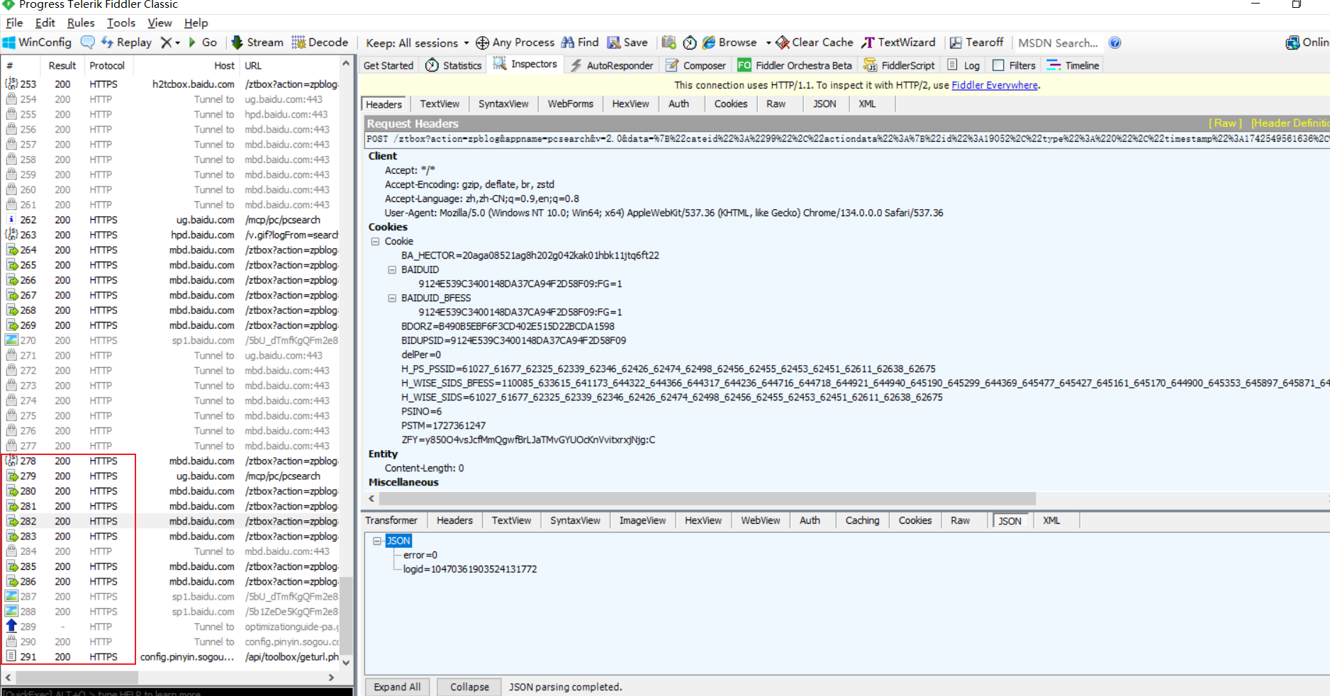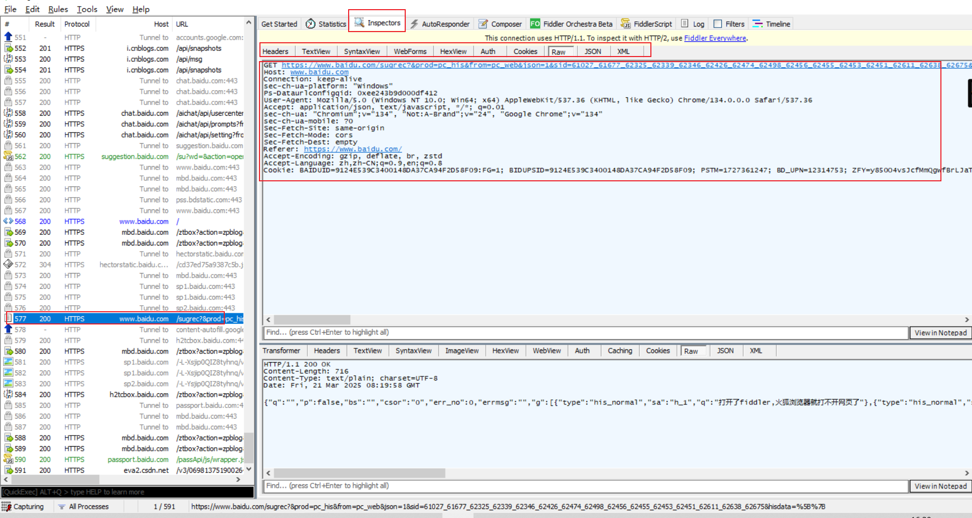 查看会话列表,选择其中一个会话,查看请求信息中 Inspectors,查看详细数据