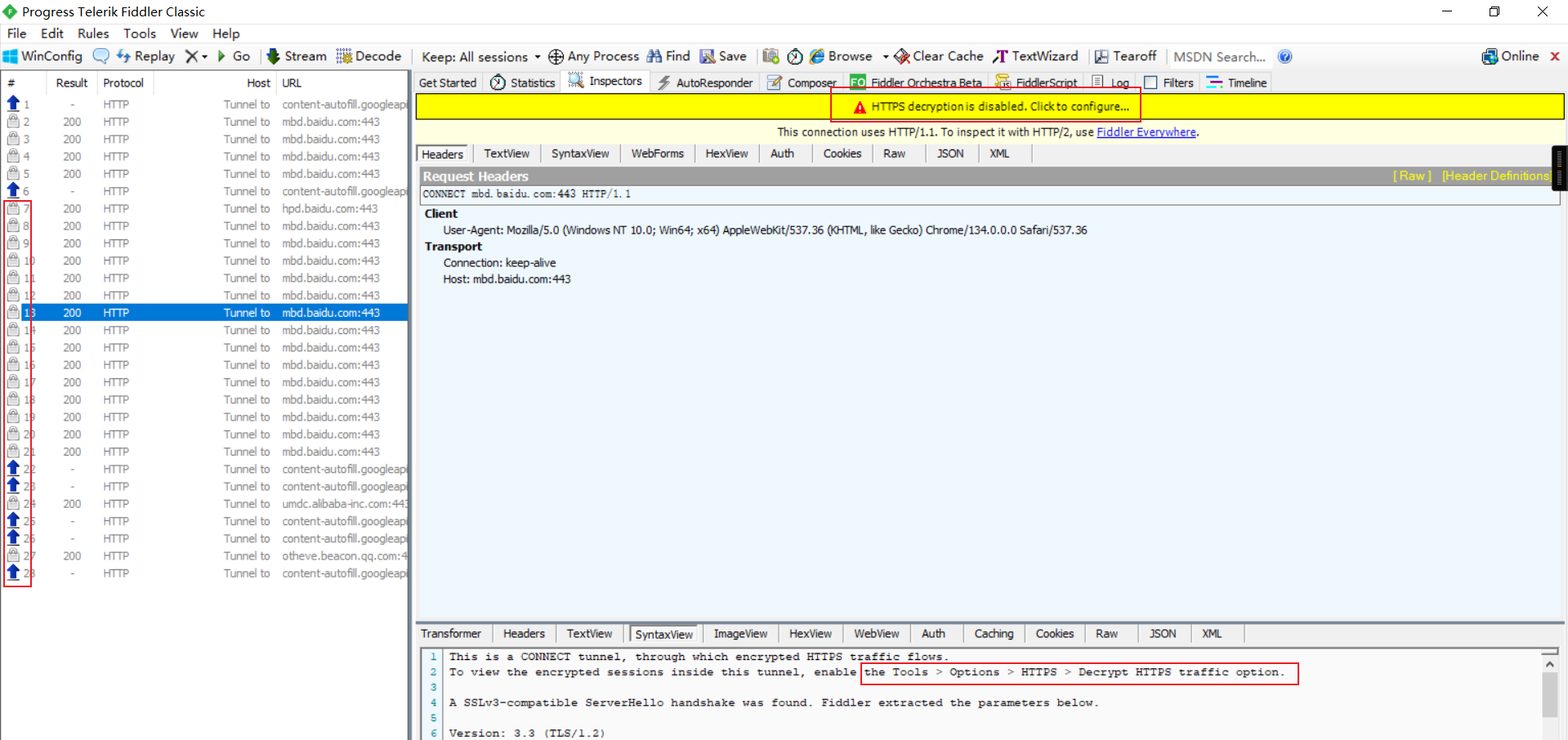 从图中可以看出到,左侧的请求都是一把锁的样式这种情况下是没法看到请求里面具体的信息的右边返回内容中提示了"This is a CONNECT tunnel, through which encrypted HTTPS traffic flows",然后给出了具体的设置路径To view the encrypted sessions inside this tunnel, enable the Tools > Options > HTTPS > Decrypt HTTPS traffic option。只需要取到这个路径里面把对应的选项勾选上。