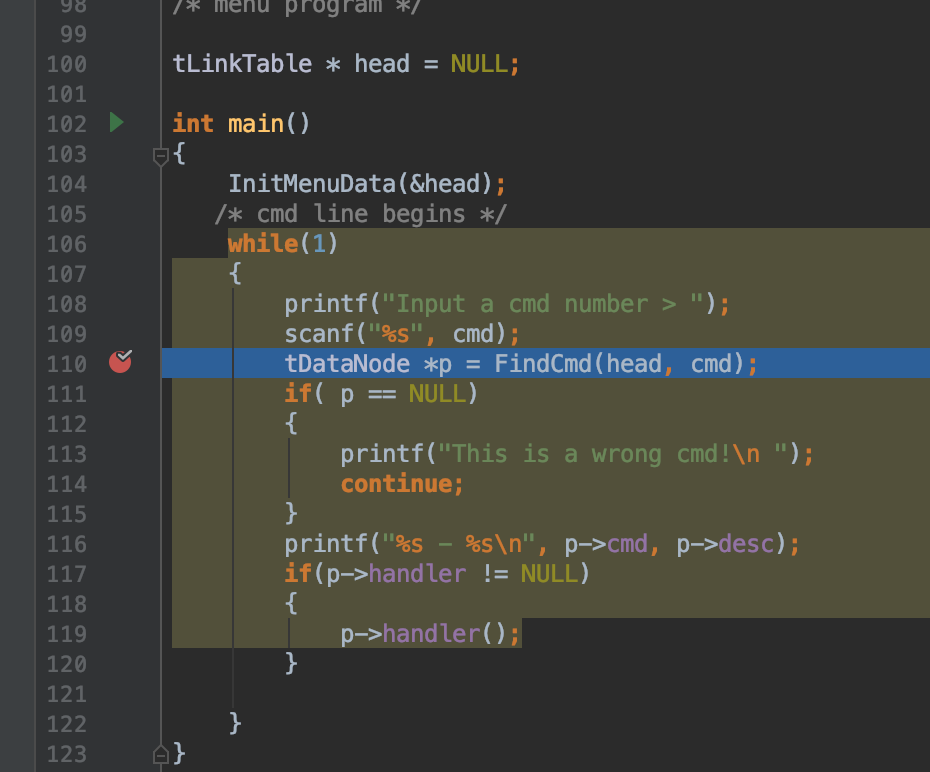 int SearchCondition(tLinkTableNode * pLinkTableNode) { tDataNode * pNode = (tDataNode *)pLinkTableNode; if(strcmp(pNode->cmd, cmd) == 0) { return SUCCESS; } return FAILURE; }
