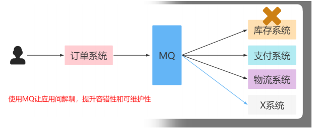 如果在系统中引入MQ,即订单系统将消息先发送到MQ,MQ再转发到其他系统,则会解决以下问题: