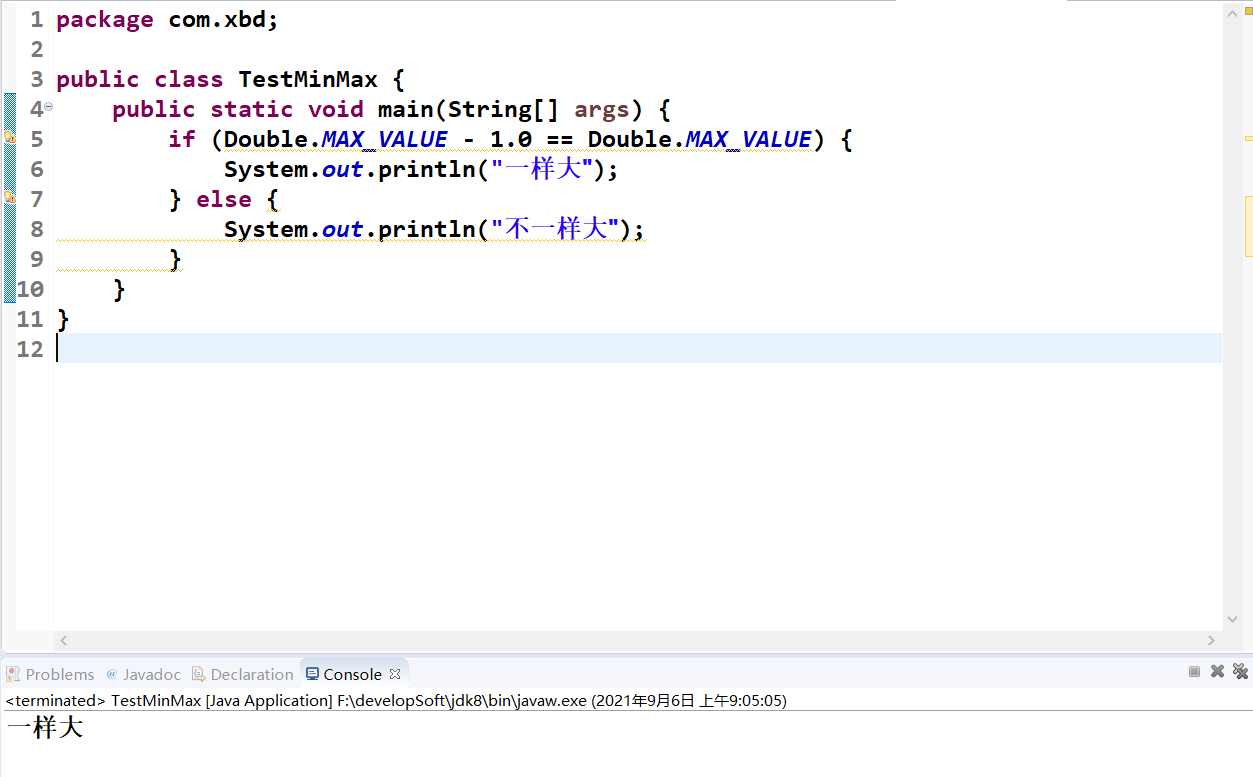原因:double类型的数进行运算,首先需要对阶,double类型的最大值是1.7976931348623157 x \(10^{308}\),运算前数字1.0会先变成0.00000...[此处省略308个0]1 * \(10^{308}\) 再进行运算,但是double类型只能精确到小数点后16位,0.00000...[此处省略308个0]1 * \(10^{308}\) 后面的1精确不到,就相当于0,所以Double.MAX_VALUE - 1.0
