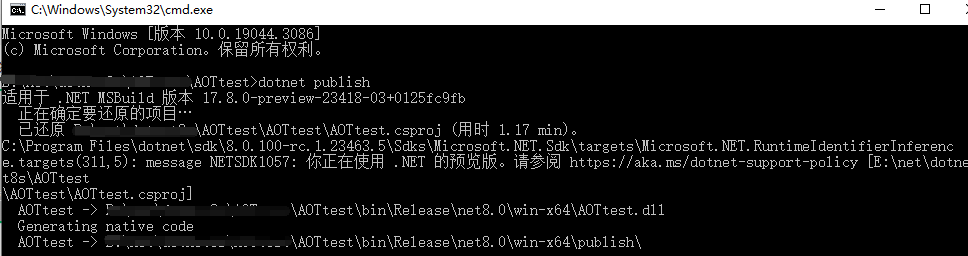 Visual Studio 不支持发布 AOT 应用,所以使用.NET Core CLI命令"dotnet publish"来发布。发布成功的窗口如下: