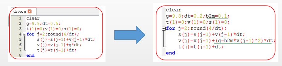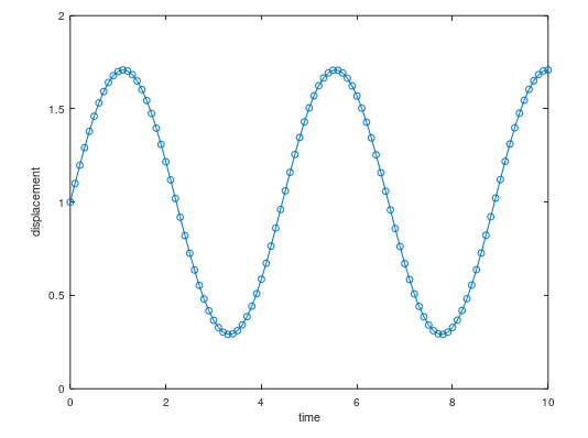 clear k=1;s(1)=0.1;v(1)=0; t(1)=0;dt=0.1; for i=1:1000 v(i+1)=v(i)-k*s(i)*dt; s(i+1)=s(i)+v(i+1)*dt; t(i+1)=t(i)+dt; endfor