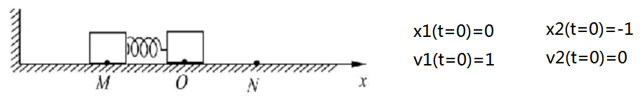 After the iteration, we can obtain the displacement of 1 and 2 as a function of time (shown on the left). The figure on the right is the distance of 1 and 2, which shows a typical trajectory of single spring oscillator.