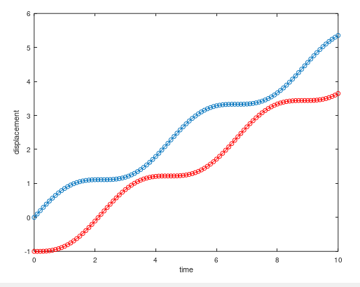 clear k=1;s1(1)=0;v1(1)=1; s2(1)=-1;v2(1)=0; t(1)=0;dt=0.1; for i=1:100 v1(i+1)=v1(i)-k*(s1(i)-s2(i)-1)*dt; v2(i+1)=v2(i)+k*(s1(i)-s2(i)-1)*dt; s1(i+1)=s1(i)+v1(i+1)*dt; s2(i+1)=s2(i)+v2(i+1)*dt; t(i+1)=t(i)+dt; endfor