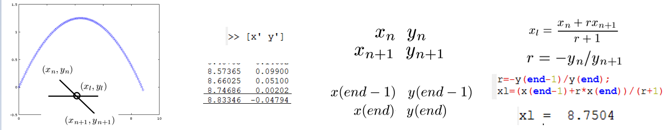 The landing point is the x_L value with y_L=0. However, in most calculations, we will find y(i)>0 and y(i+1)<0. Suppose the slope is the same when dt is small enough.