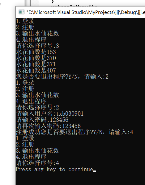#include <stdio.h>#include <string.h>void mainMenu();void login();void regist();void shuiXianHua();void returnToMenu();main(){ mainMenu();}void mainMenu(){ int i; printf("1.登录\n"); printf("2.注册\n"); printf("3.输出水仙花数\n"); printf("4.退出程序\n"); printf("请你选择序号:"); scanf("%d",&i); switch (i) { case 1:login(); break; case 2:regist(); break; case 3:shuiXianHua(); break; }}void login(){ char uname[20],upwd[20]; printf("请输入你的用户名:"); scanf("%s",uname); printf("请输入密码:"); scanf("%s",upwd); if (strcmp(uname,"admin")==0&&strcmp(upwd,"admin")==0) { printf("登陆成功"); }else { printf("登陆失败"); } returnToMenu();}void regist(){ char uname[20],upwd1[20],upwd2[20]; printf("请输入用户名:"); scanf("%s",uname); printf("请输入密码:"); scanf("%s",upwd1); printf("请再次输入密码:"); scanf("%s",upwd2); if (strcmp(upwd1,upwd2)==0) { printf("注册成功"); }else { printf("注册失败"); } returnToMenu();}void shuiXianHua(){ int i,ge,shi,bai; i=100; while(i<1000) { ge=i%10; shi=i/10%10; bai=i/100; if (ge*ge*ge+shi*shi*shi+bai*bai*bai==i) { printf("水花仙数是%d\n",i); } i++; } returnToMenu();}void returnToMenu(){ char answer[20]; printf("您是否要退出程序?Y/N,请输入:"); scanf("%s",answer); if (strcmp(answer,"Y")==0) { printf("谢谢使用,再见\n"); }else { mainMenu(); }}