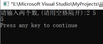 #include <stdio.h>int max(int a,int b);main(){ int a,b; printf("请输入两个数,(请用空格隔开):"); scanf("%d %d",&a,&b); printf("%d\n",max(a,b));}int max(int a,int b){ if (a>b) return a; else return b; }