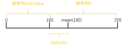 举个例子:如果使用平均值方法,平均值mean为190,差值delta为30。那么灰度小于160的像素为0,大于等于160的像素为255。如下图: