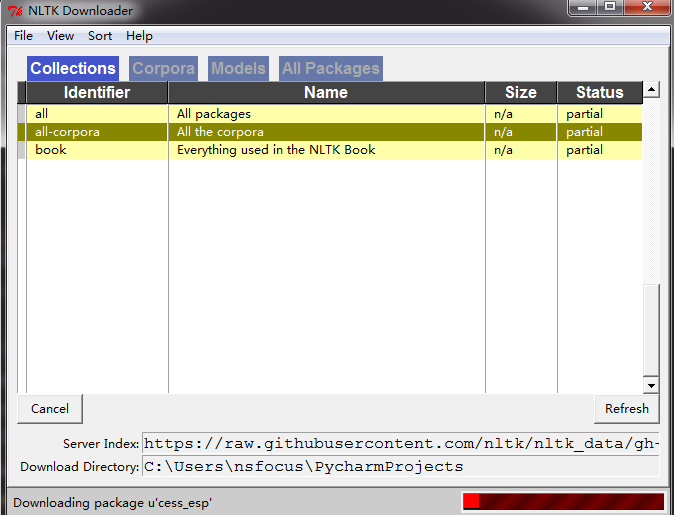 先点击Refresh,刷新下,之后选中all-corpora点击左下角下载就好,至于路径