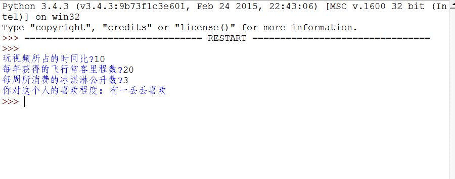 #coding:utf-8 from numpy import * import operator from collections import Counter import matplotlib import matplotlib.pyplot as plt import sys sys.path.append("D:\python\Mechine learing in Action\KNN") import date date.classifyPerson()