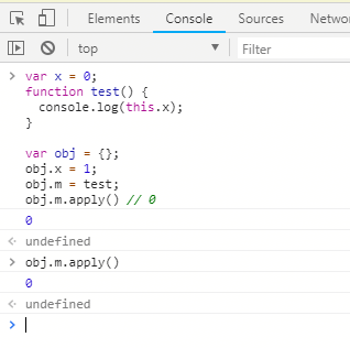 apply()的参数为空时,默认调用全局对象。因此,这时的运行结果为0,证明this指的是全局对象。