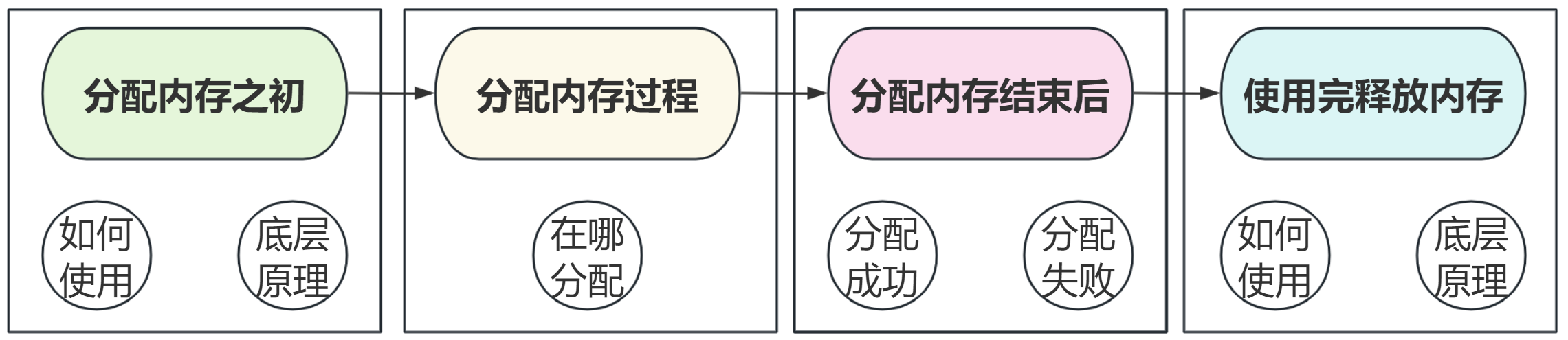 从分配内存到释放内存整个过程的角度看一下这四个的区别,首先明确一下