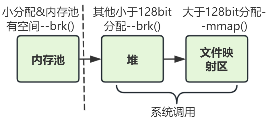 malloc会维护一个内存池,可以使用brk(),如果分配的内存比较小可以直接从内存池分配,如果内存池没有足够空间再考虑系统调用。主要是避免频繁系统调用的消耗。