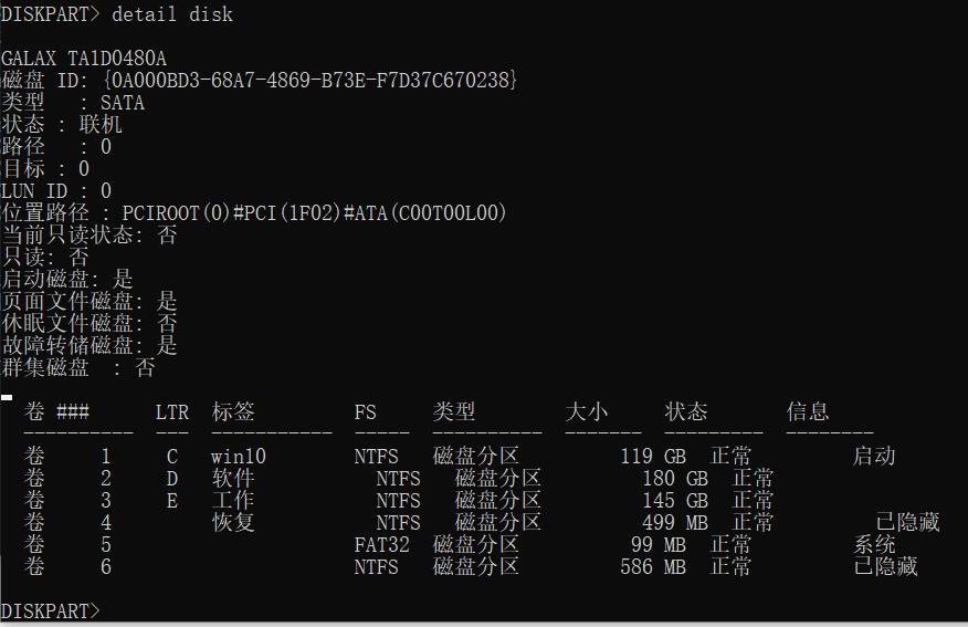 list disk # 选择想要查看的磁盘 id select disk 0 detail disk
