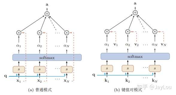 这种编码方式为软性注意力机制(soft Attention),软性注意力机制有两种:普通模式(Key=Value=X)和键值对模式(Key!=Value)。