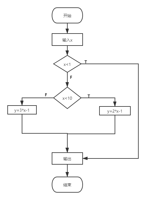 #include<stdio.h> main () { float x,y; printf("请输入x的值:"); scanf("%f",&x); if(x<1) y=x; if(x>=1&&x<10) y=2*x-1; else y=3*x-1; printf("y的值为%.2f\n",y); }