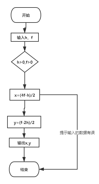 #include<stdio.h> main () { int h,f,x,y; printf("鸡兔总数,鸡兔脚总数:"); scanf("%d,%d",&h,&f); if(h>0&&f>0) { x=(4*h-f)/2; y=(f-2*h)/2; printf("鸡有%d 兔有%d\n",x,y); } else printf("输入错误!\n"); }