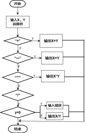 #include <stdio.h> int main (int argc,char*argv[]) { char op; float x,y; printf("请输入例如1+2的形式:"); scanf("%f%c%f",&x,&op,&y); for(;;) { switch(op) { case'+': printf("=%f\n",x+y);break; case'-': printf("=%f\n",x-y);break; case'*': printf("=%f\n",x*y);break; case'/': if(y==0) printf("wrong input\n"); else printf("=%f\n",x/y);break; default: printf("Wrong input\n");break; } printf("请输入例如1+2的形式:"); scanf("%f%c%f",&x,&op,&y); } return 0; }