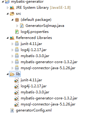 1、创建javaSE项目mybatis-generator,导入以下jar包,项目结构如图所示: