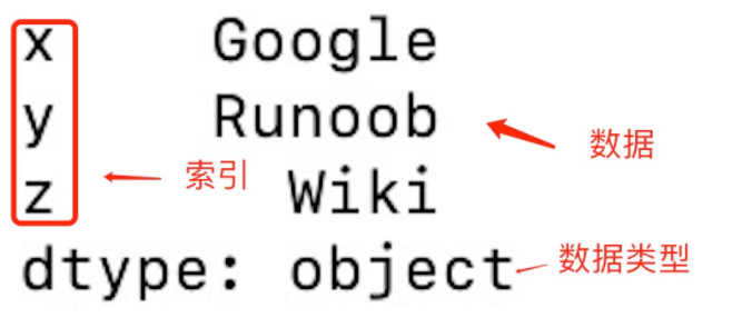 import pandas as pd a = ["Google","Runoob",'Wiki'] myvar = pd.Series(a,index = ["x","y","z"]) print(myvar)