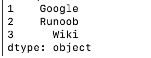 import pandas as pd sites = {1:"Google", 2:"Runoob", 3:"Wiki"} myvar = pd.Series(sites) print(myvar)